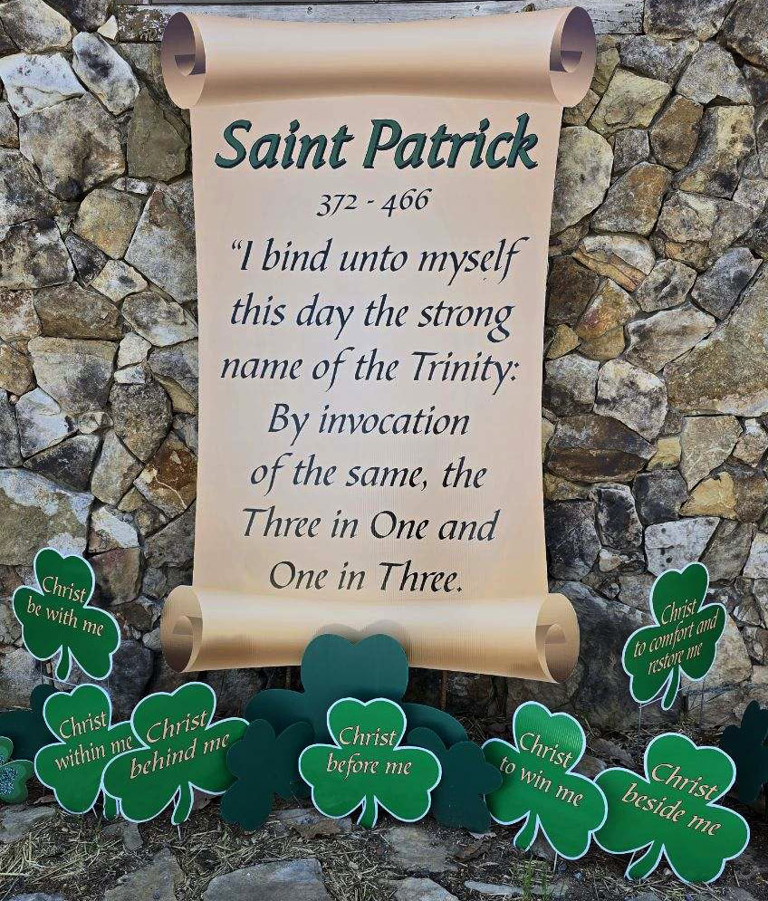 Here is what pilgrims see on their way to the top of Prayer Mountain: This display was shown in the month of March in Honor of St. Patrick’s Day.