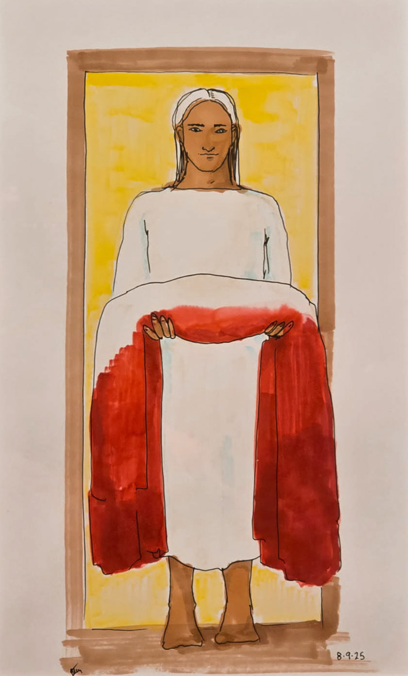 He held a cloth that had been socked in the blood of Jesus.