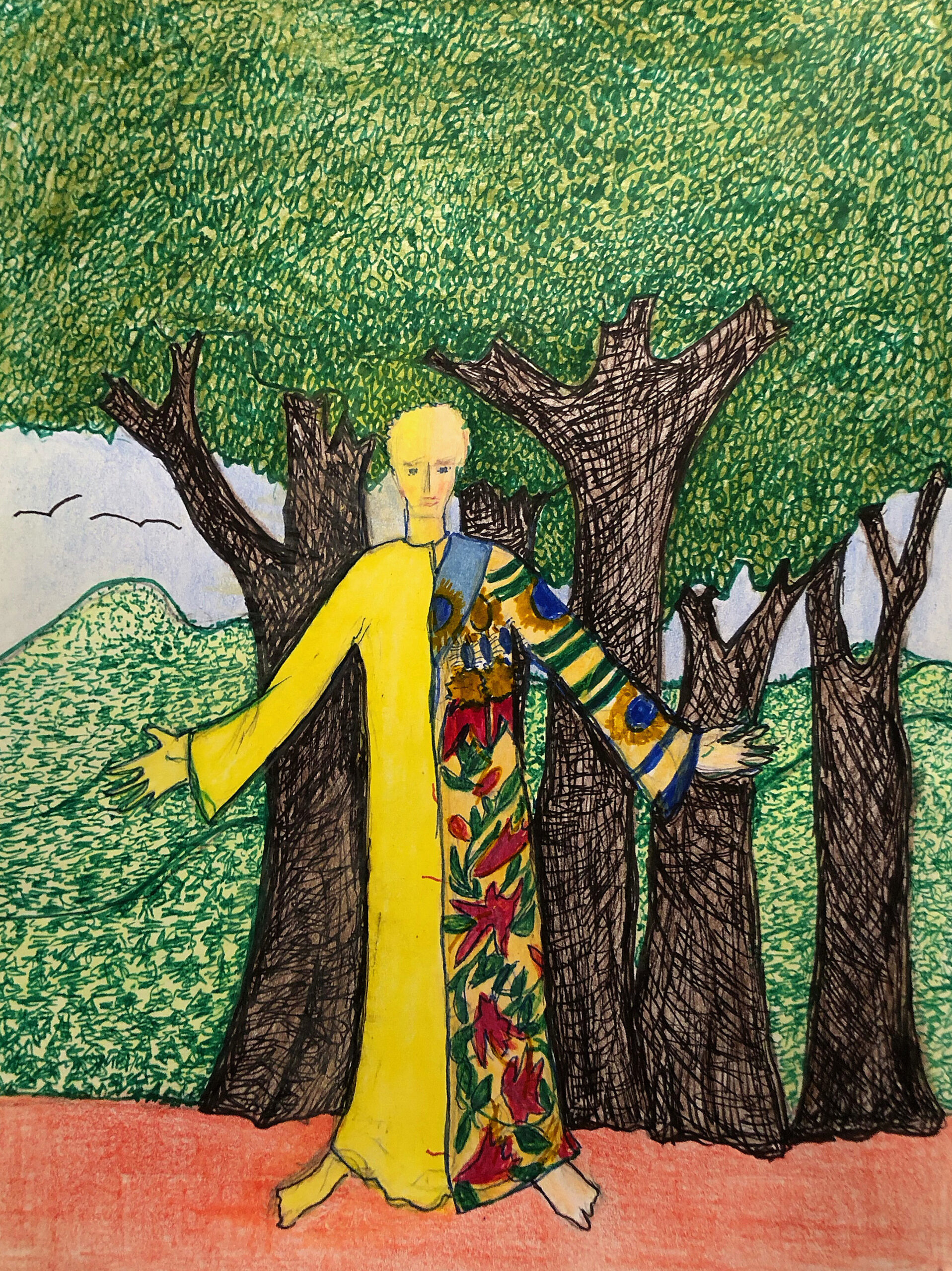 His garments as well as the angel himself were split right down the middle. One side of the angel looked bright and new. The other side, one could tell, had been new at one time, but now was a dark cream color. The side that was new shone brightly. However, the old was hung with medals and encrusted with heavy, beautiful embroidery – with gold woven into it.